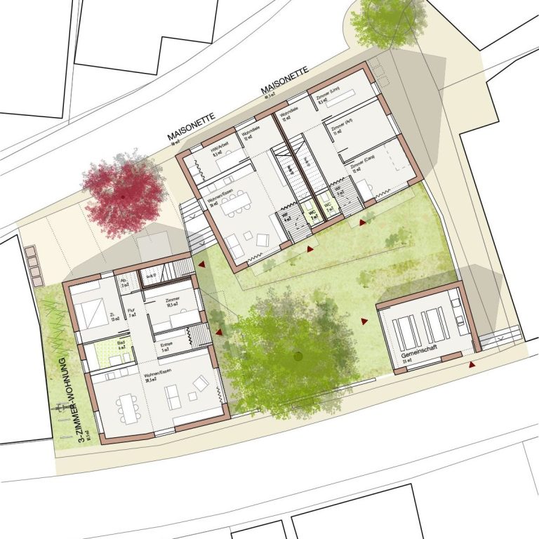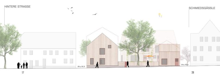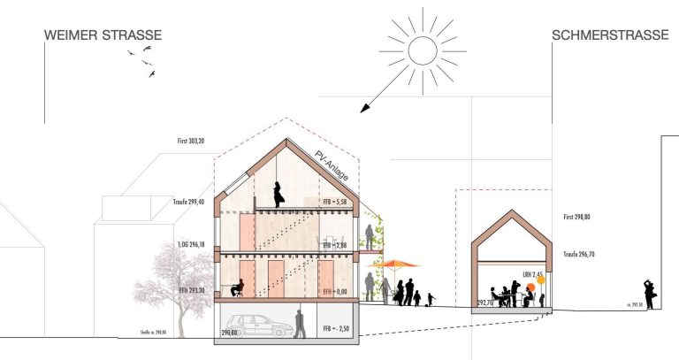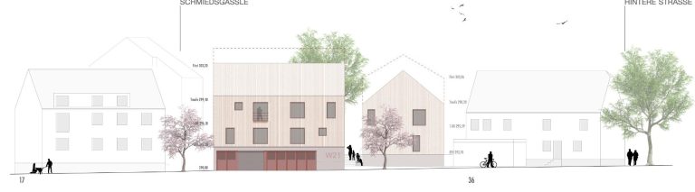 Die Gebäude werden als konstruktiver Holzbau auf STB-Bodenplatten, teilweise unterkellert aufgestellt. Geschlossene Fassaden sind als hinterlüftete Holzfassade mit senkrechten Lamellen aus Lärche mit einem Öffnungsanteil ca. 50% konzipiert. Die verglasten Fassaden werden als Holz-Fensterkonstruktionen mit Dreifach-Verglasung geplant. Die sichtbaren Oberflächen der Bauteile werden materialimmanent belassen und machen somit die Architektur begreifbar. Klare Grundrisse mit dezidierten Bezügen nach Außen lassen hochwertige Lebensräume mit spannenden Ein- und Ausblicken entstehen.
